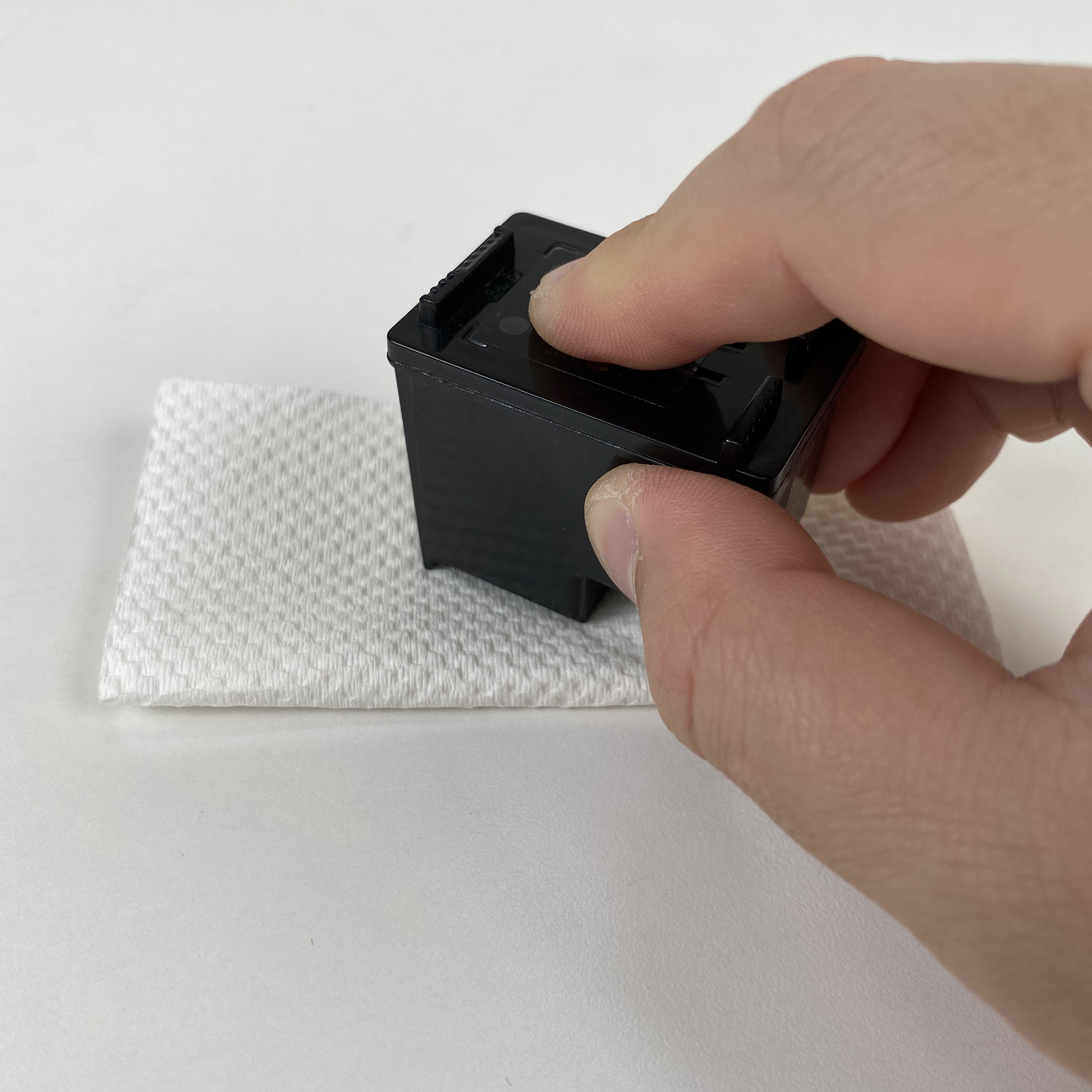 If you have printed a document but are not satisfied with the print quality, you may need to perform a cleaning cycle to improve the print quality. You can clean through the control panel on your printer, if your printer does not have a control panel, select the "Perform a cleaning cycle from your computer" troubleshooting for further assistance. Please be awear that this process may vary by printer, and you can also check the printer's user manual for instructions on performing a cleaning cycle. Press the Menu button on the printer. Scroll to "Tools" and press "OK". Scroll to "Clean Printhead" and press "OK". After the cycle is complete, your printer will print a test page. If the quality of the test page is satisfactory, press "OK" to exit the cleaning cycle. You may return to the document you wish to print and resume printing. You may also perform another cleaning cycle if you are not satisfied with your test page. Please be aware that cleaning the printhead does consume ink; and therefore, it should only be done when necessary. If the test page is satisfactory, you can go back to the document you want to print and resume printing. If the test page is not satisfactory after the cleaning cycles, The next step is to try blotting the cartridge to make sure that the printhead nozzles are not clogged with dry ink. We recommend that you use a lint free cloth and place a paper towel or other absorbent material under the lint free cloth to protect your surface from the ink, which may stain your underlying surface. Remove the cartridge from the printer. Find the printhead. It's on the bottom of the cartridge. Do not touch the printhead or bottom of the cartridge, as this can damage the cartridge. Hold the ink cartridge with the printhead facing downward. Just press the printhead of the cartridge onto the lint free towel and hold for 3 seconds. After you lift the ink cartridge up, a smear should appear on the lint free cloth (Figure 1).