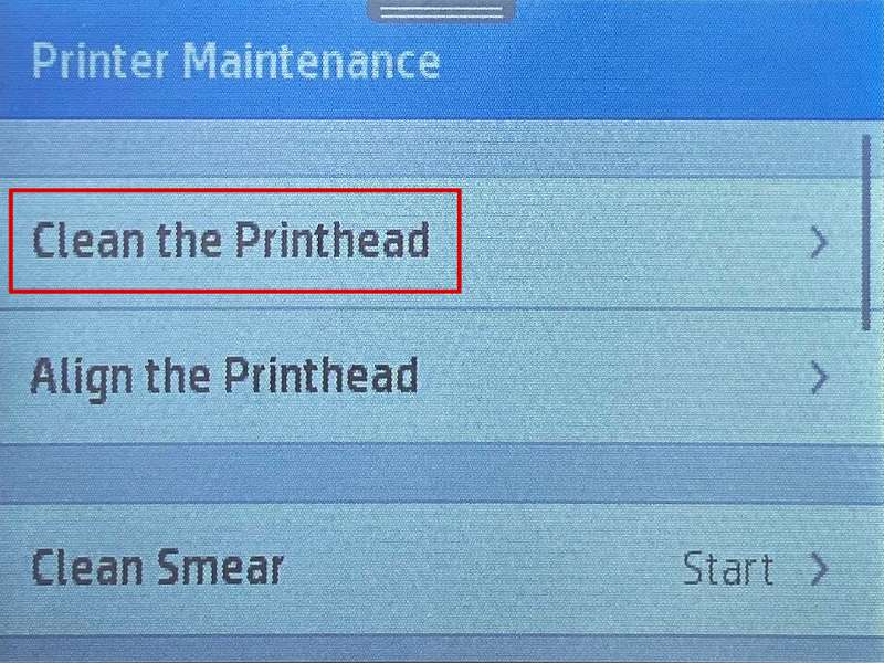If you have printed documents but are not satisfied with the print quality, you may need to perform a cleaning cycle to improve the print quality. Try the steps below to do this. Please be aware that this process may vary by printer, and you can also consult the printer's user manual for instructions on performing a cleaning cycle. On the printer's LCD screen, select "Setup" (Figure 1). Then select the "Printer Maintenance" (Figure 2). Select "Clean Printhead" (Figure 3). You will watch the printer perform a cleaning cycle. After the cycle is complete, your printer will print a test page. After printing the test page, you can select "No" to finish, or if you are not satisfied with the test page, you can select "Yes" to continue with another cleaning cycle. Please be aware that cleaning the printhead does consume ink; and therefore, it should only be done when necessary. If the test page is satisfactory, you may return to the document you wish to print and resume printing. If the test page is not satisfactory after a cleaning cycle, you may need to replace the inkjet cartridges.