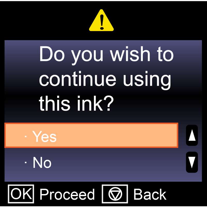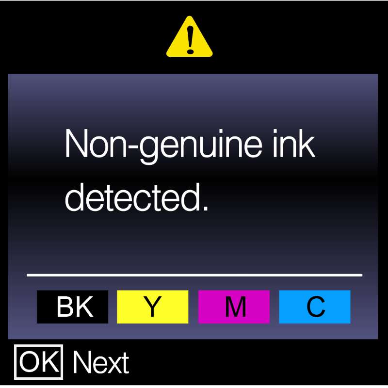 If you encounter an error message stating that "Non-genuine ink detected" (Figure 1), you will need to continue through this error message to allow your printer to print your document. Just follow the on-screen instructions to continue viewing this error message (if applicable) and select "Continue". If prompted to continue using this ink, be sure to select "Yes" (Figure 2). Selecting "No" will not allow your printer to use these ink cartridges.