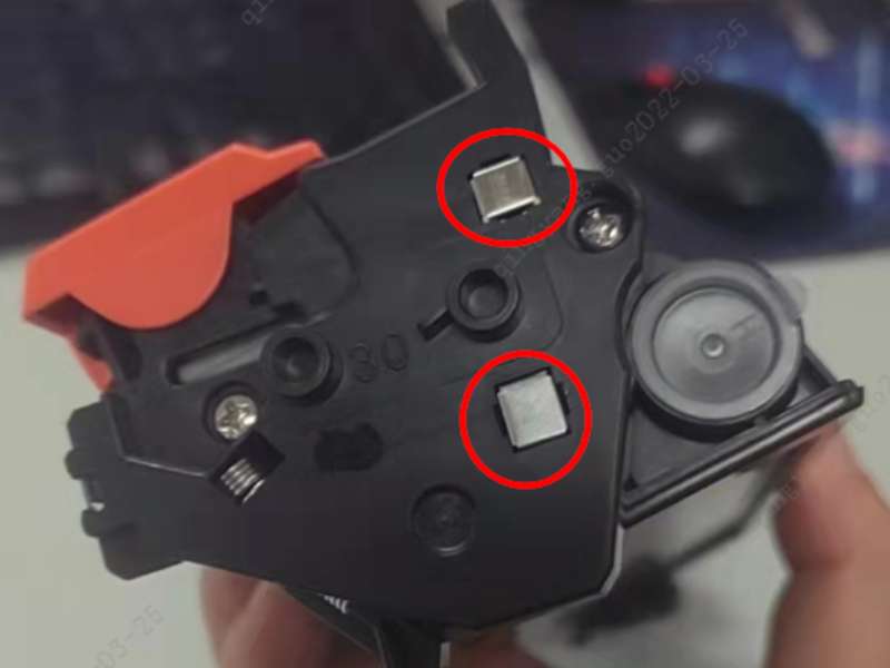 2. Check the two metal contacts on the left side of the toner cartridge (pictured) to make sure there is no oil stain or any impurities. Clean the stain if necessary.
