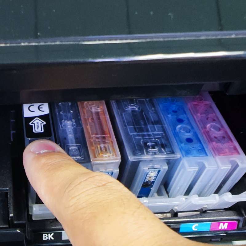 Firstly, remove the cartridge that caused the error from the cradle. When you open the printer lid, you will see that the cartridge that is not being recognized does not have a red light in front of it. Gently push out on the tab on the front of the cartridge. Reinstall the ink cartridge (Figure 2) and you should hear it "click" into place.