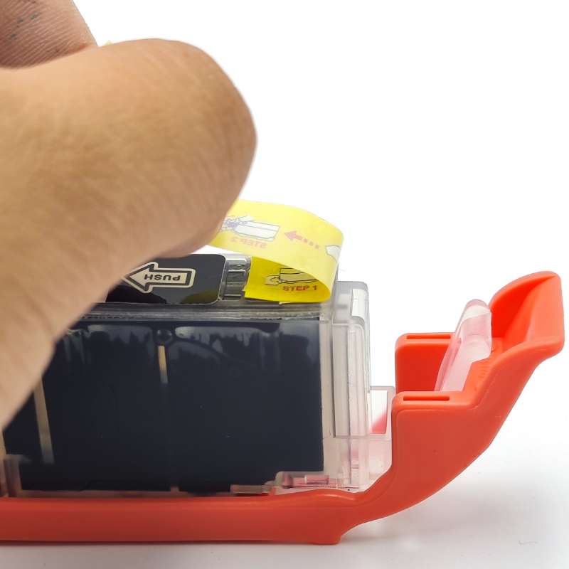 Make sure that the cartridge pictured matches the cartridge in your hand or installed in the printer (Figure 1). Verify that the printer you are using is listed in the printer compatibility table as a suitable printer for the cartridge you are trying to install. If One of these Two criteria do Not match, you have most likely received the incorrect ink cartridge for the printer. Please visit our Printer Compatibility page to assure the cartridge required for your printer. After confirming that your ink cartridge is correct for your printer, the first step is to remove the pull tab and clip from the cartridge.