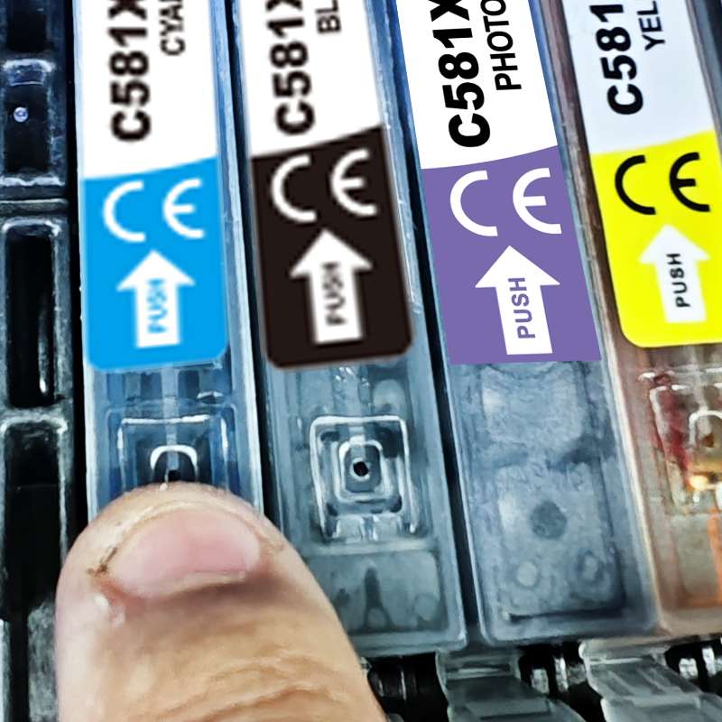 Firstly, remove the cartridge that caused the error from the cradle. When you open the printer lid, you will see that the cartridge that is not being recognized does not have a red light in front of it. Gently push out on the tab on the front of the cartridge. Reinstall the ink cartridge (Figure 2) and you should hear it "click" into place. If the ink cartridge is still not being recognized, remove the ink cartridge from the cradle again. Confirm that there is a chip intact and in the correct location.