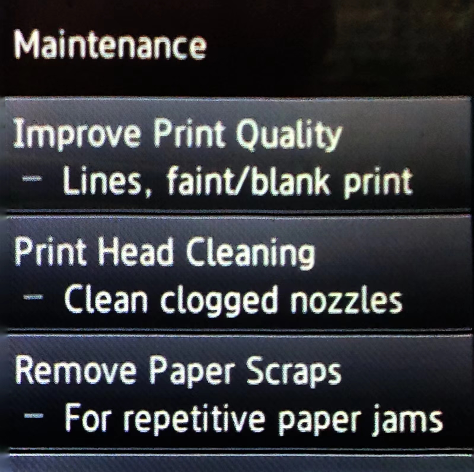 Select "Yes" and press "OK". Follow any on-screen prompts that may appear. After cleaning, a test page will be printed to let you confirm the status. If the print on your test page is satisfactory, you may return to the document you wish to print and resume printing. If the quality on the test page is still unsatisfactory, you can choose to perform a Deep Cleaning. Please be aware that cleaning the printhead does consume ink; and therefore, it should only be done when necessary. If the test page is not satisfactory after a cleaning cycle, you may need to replace the inkjet cartridges.