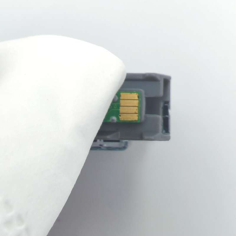 To clean the chip, you can use a pencil eraser. Brush the chip lightly with the eraser to remove any potential obstruction or debris. Or you can use any type of lint free cloth to gently wipe the chip (Figure 3), again to remove any type of obstruction or debris. Once this is complete, replace the ink cartridge in the cradle. If the problem persists, you need to reset the printer. This can be done by turning off the computer and the printer with the cartridge installed. Unplug your printer and let your machines off for 2 minutes. Restart the printer and computer, and try printing again. If you tried both steps and got the same error, there is most likely an electrical problem with the cartridge and you should return the cartridge to where you purchased it.