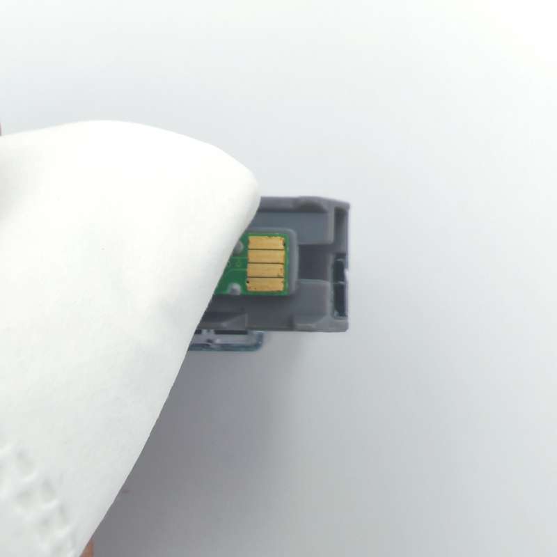 To clean the chip, you can use a pencil eraser. Brush the chip lightly with the eraser to remove any potential obstruction or debris. Or you can use any type of lint free cloth to gently wipe the chip (Figure 3), again to remove any type of obstruction or debris. Once this is complete, replace the ink cartridge in the cradle. If the problem persists, you need to reset the printer. This can be done by turning off the computer and the printer with the cartridge installed. Unplug your printer and let your machines off for 2 minutes. Restart the printer and computer, and try printing again. If you tried both steps and got the same error, there is most likely an electrical problem with the cartridge and you should return the cartridge to where you purchased it.