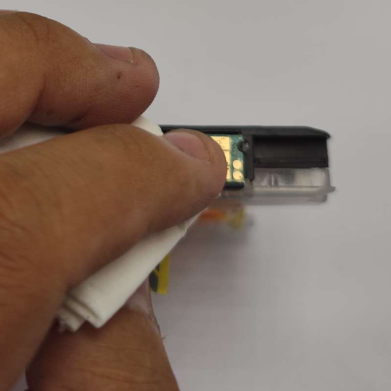 To clean the chip, you can use a pencil eraser. Brush the chip lightly with the eraser to remove any potential obstruction or debris. Or you can use any type of lint free cloth to gently wipe the chip (Figure 3), again to remove any type of obstruction or debris. Once this is complete, replace the ink cartridge in the cradle. If the problem persists, you need to reset the printer. This can be done by turning off the computer and the printer with the cartridge installed. Unplug your printer and let your machines off for 2 minutes. Restart the printer and computer, and try printing again. If you tried both steps and got the same error, there is most likely an electrical problem with the cartridge and you should return the cartridge to where you purchased it.
