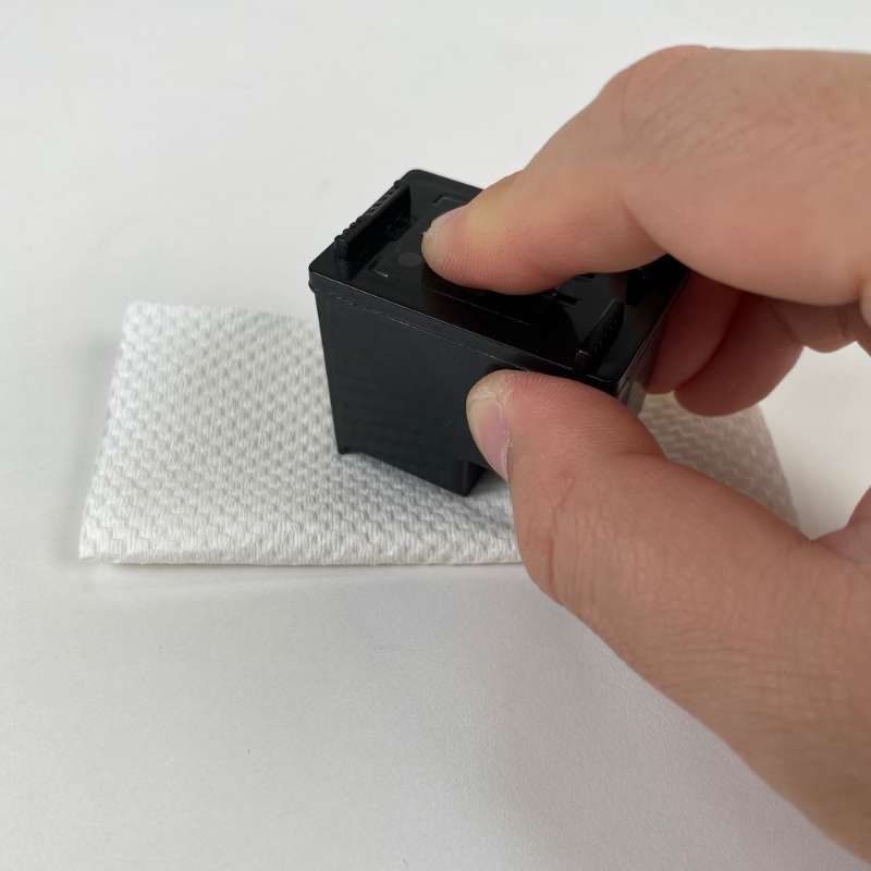 If you have printed a document but are not satisfied with the print quality, you may need to perform a cleaning cycle to improve the print quality. You can clean through the control panel on your printer, if your printer does not have a control panel, select the "Perform a cleaning cycle from your computer" troubleshooting for further assistance. Please be awear that this process may vary by printer, and you can also check the printer's user manual for instructions on performing a cleaning cycle. Press the Menu button on the printer. Scroll to "Tools" and press "OK". Scroll to "Clean Printhead" and press "OK". After the cycle is complete, your printer will print a test page. If the quality of the test page is satisfactory, press "OK" to exit the cleaning cycle. You may return to the document you wish to print and resume printing. You may also perform another cleaning cycle if you are not satisfied with your test page. Please be aware that cleaning the printhead does consume ink;and therefore, it should only be done when necessary. If the test page is satisfactory, you can go back to the document you want to print and resume printing. If the test page is not satisfactory after the cleaning cycles, The next step is to try blotting the cartridge to make sure that the printhead nozzles are not clogged with dry ink. We recommend that you use a lint free cloth and place a paper towel or other absorbent material under the lint free cloth to protect your surface from the ink, which may stain your underlying surface. Remove the cartridge from the printer. Find the printhead. It's on the bottom of the cartridge. Do not touch the printhead or bottom of the cartridge, as this can damage the cartridge. Hold the ink cartridge with the printhead facing downward. Just press the printhead of the cartridge onto the lint free towel and hold for 3 seconds. After you lift the ink cartridge up, a smear should appear on the lint free cloth (Figure 1).