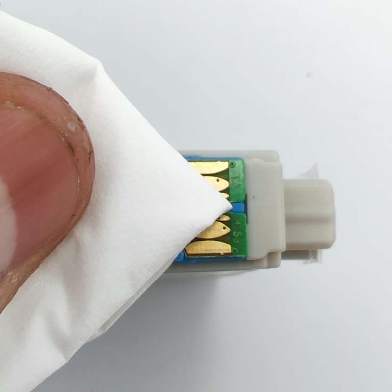 To clean the chip, you can use a pencil eraser. Brush the chip lightly with the eraser to remove any potential obstruction or debris. Or you can use any type of lint free cloth to gently wipe the chip (Figure 3), again to remove any type of obstruction or debris. Once this is complete, replace the ink cartridge in the cradle. If the problem persists, you need to reset the printer. This can be done by turning off the computer and the printer with the cartridge installed. Unplug your printer and let your machines off for 2 minutes. Restart the printer and computer, and try printing again. If you tried both steps and got the same error, there is most likely an electrical problem with the cartridge and you should return the cartridge to where you purchased it.